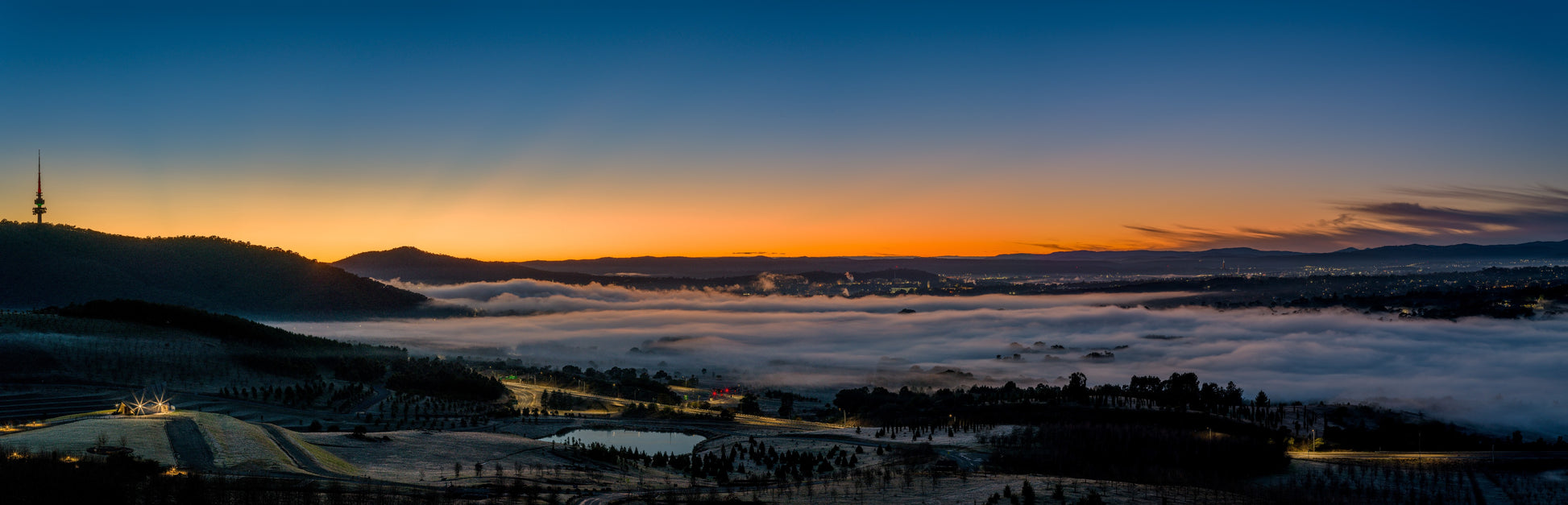 Sunrise panorama of Lake Burley Griffin and Canberra covered in morning fog at sunrise.